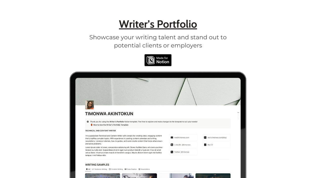 Writer's Portfolio is a versatile Notion template designed to help writers showcase their talent, skills, and expertise easily. Whether you're a content creator, storyteller, technical writer, or any type of writer, it is the ultimate solution for creating a professional online presence. With Writer's Portfolio, you can elegantly display your best writing samples, ranging from articles and stories to technical documents. Impress potential clients or employers by showcasing the breadth of your writing talent in one convenient space. Highlight your proficiency across various writing styles, software tools, and languages, and let your skills shine through. Whether you're an expert in content creation, ghostwriting, or academic writing, Writer's Portfolio allows you to effortlessly demonstrate your versatility and expertise. In addition, you can display your educational background, professional certifications, and any awards or recognition you've received to establish your credibility and showcase your commitment to excellence in the field of writing. Finally, wrap up your portfolio with a compelling "Hire Me" section, inviting interested parties to reach out and explore collaboration opportunities. Whether you're seeking freelance projects or employment opportunities, Writer's Portfolio makes it easy for potential clients to connect with you. Elevate your professional brand and stand out in a competitive landscape with Writer's Portfolio – the ultimate tool for writers looking to make a lasting impression online.