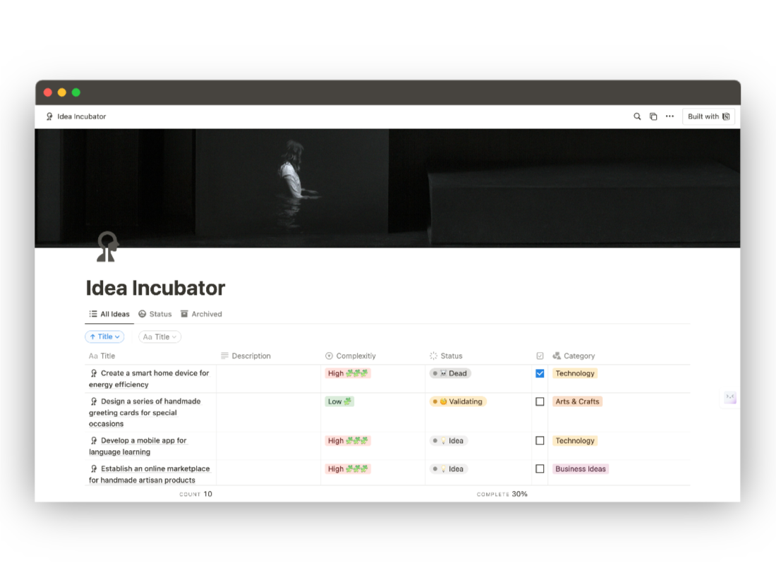 Idea Incubator is a free Notion template that helps you record and organize your ideas so you don't forget them. Start bringing your visions to life today! Thomas Edison once said, 'Genius is one percent inspiration and ninety-nine percent perspiration.' However, he didn't mention that inspiration can be fleeting. That's why I created Idea Incubator, a Notion template that helps you record your ideas so you don't forget them. Whether you're an entrepreneur, a creative professional, or someone with ideas they want to bring to life, Idea Incubator is perfect for you. This template lets you easily record your ideas, including their name, description, complexity level, and status. But that's not all. I've also included Steps to Validating an Idea. This guide will help you take your idea from conception to reality. With this guide, you'll be able to identify your target audience, validate your idea, and even create a unique value proposition that sets you apart from your competitors. Keep your great ideas from slipping away; start using Idea Incubator today and turn your inspiration into reality.