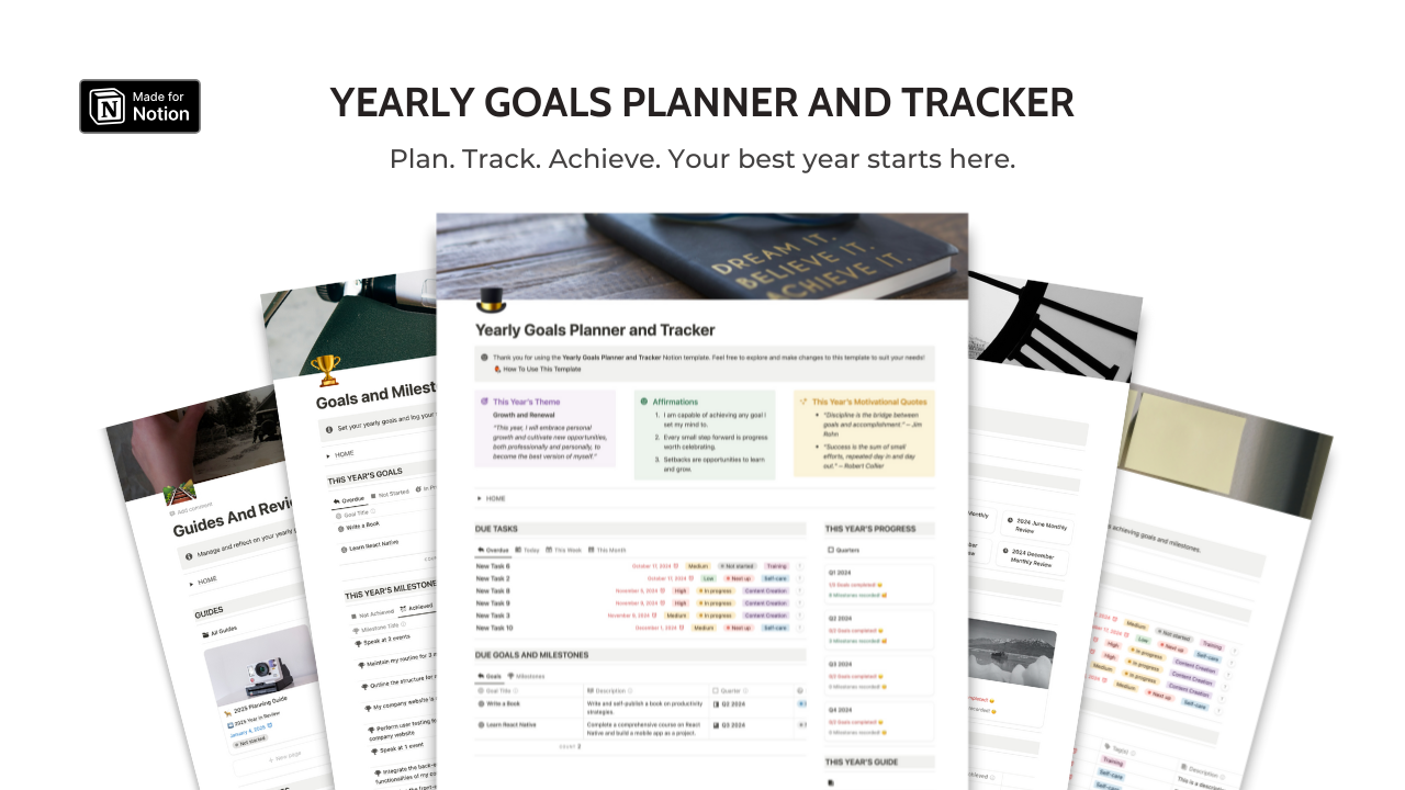 Take control of your year with the Yearly Goals Planner and Tracker Notion Template, a powerful tool designed to help you set, monitor, and achieve your yearly aspirations. Whether you want to stay focused on your New Year's resolutions, track personal growth, or manage your milestones, this tracker empowers you to turn your goals into actionable outcomes. Key Features Goal Setting & Tracking: Organise your goals into categories, assign priorities, and break them into smaller milestones for better tracking. Specify the quarter you plan to achieve each goal and monitor progress effortlessly.Milestones Tracking: Record every significant event, positive or negative. Reflect on achievements, celebrate wins, and learn from setbacks.Periodic Reviews: Write monthly reviews to reflect on your progress, learnings, and areas for improvement. Link goals and milestones to these reviews for deeper insights.Quarterly Progress: Break the year into four quarters and assign goals, milestones, and reviews to specific periods, providing a focused view of your achievements over time.Planning Guide: Plan your year by defining your theme, setting clear goals, and breaking them into actionable milestones.Guiding Principles: Define your personal rules, affirmations, and motivational quotes to keep you grounded and inspired throughout the year.Task Tracker: Manage your daily to-dos, assign priorities, and track progress. Perfect for general tasks and staying organised.End-of-Year Review: Reflect on your accomplishments, challenges, and growth with a structured review, using data from goals, milestones, and periodic reviews.Easy-to-follow Guides: Guided templates to help you plan your year, as well as write monthly reviews and end-of-year reviews. Why You Need This Planner Every year, we set resolutions and aspirations, but staying on track can be challenging. This tracker helps you: Stay accountable by documenting your goals, progress, and lessons learned.Avoid forgetting key achievements or struggles by regularly updating milestones and reviews.Gain clarity on your progress with a visual dashboard that updates based on your data.Reflect on your journey meaningfully with structured guides for reviews and reflections. Who Is Tracker This For? This tracker is perfect for anyone who: Struggles to stay consistent with their goals throughout the year.Wants a structured way to monitor progress and learn from challenges.Prefers a clean, intuitive system to keep track of personal or professional milestones. Basic Version vs Pro Version The Pro version you're purchasing includes everything. The Basic version has limited features: ✅ Goal Setting & Tracking✅ Milestones Tracking✅ Guiding Principles✅ Monthly Reviews (Guide not included)✅ End-of-Year Review (Guide not included)❌ No Quarterly Progress❌ No Planning Guide❌ No Task Tracker❌ No step-by-step guides Start the new year strong and finish even stronger with the Yearly Goals Planner and Tracker—your ultimate tool for staying focused, motivated, and productive. Product Specifications Access: Lifetime access to the template and all future updatesUpdates: Free updates as new features are addedSupport: Direct email assistance (response within 48 hours)Version: 1.0 (January 2024)Compatibility: Works with Notion web, desktop, and mobile appsRequirements: No additional software needed beyond Notion Refund Policy Please note that due to the digital nature of this template, all sales are final and no refunds will be issued. Once purchased, you receive immediate access to the complete template, which cannot be returned. Before purchasing, please: Read the complete product description to ensure this template meets your needsCheck compatibility with your devices and Notion accountReview the difference between the Basic and Pro versions to select the right option If you have any questions before purchasing, please contact [email protected] for clarification. By completing your purchase, you acknowledge and agree to this no-refund policy.